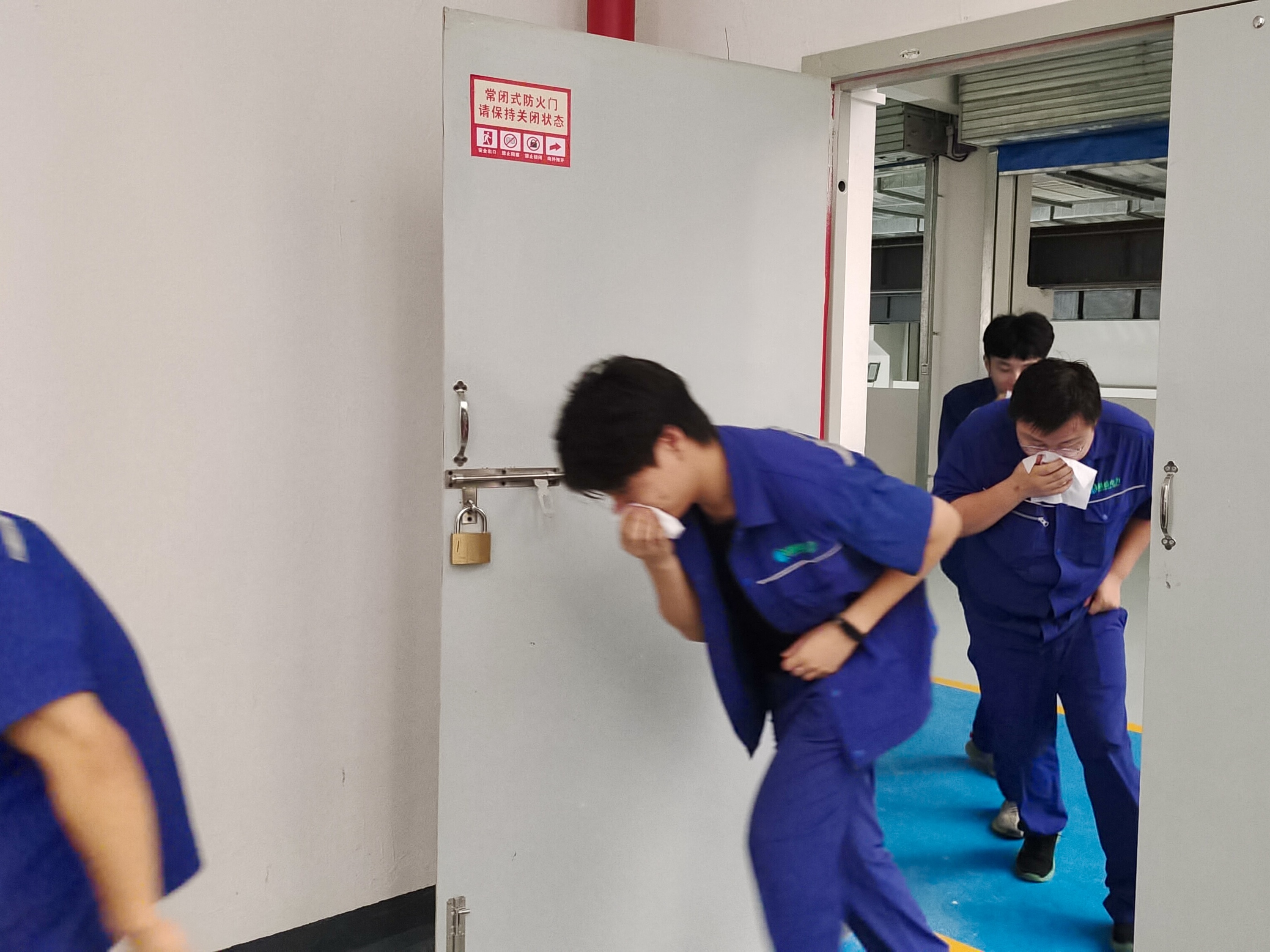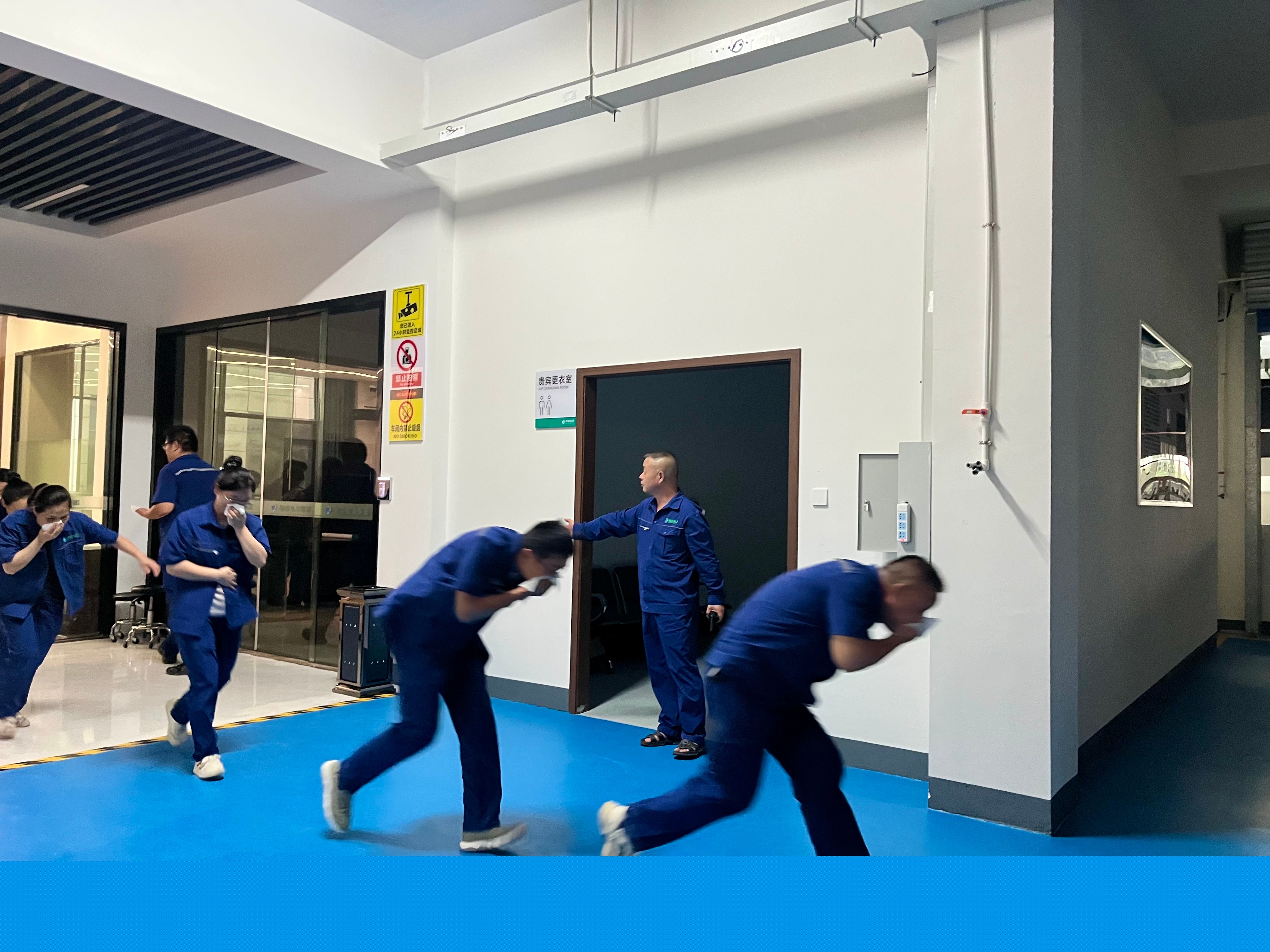 理論教學(xué)之后,實戰(zhàn)演練正式開始,隨著警報器的鳴響,參訓(xùn)人員聽從廣播指令在疏散引導(dǎo)組的指引下低腰逃生、有序撤離。