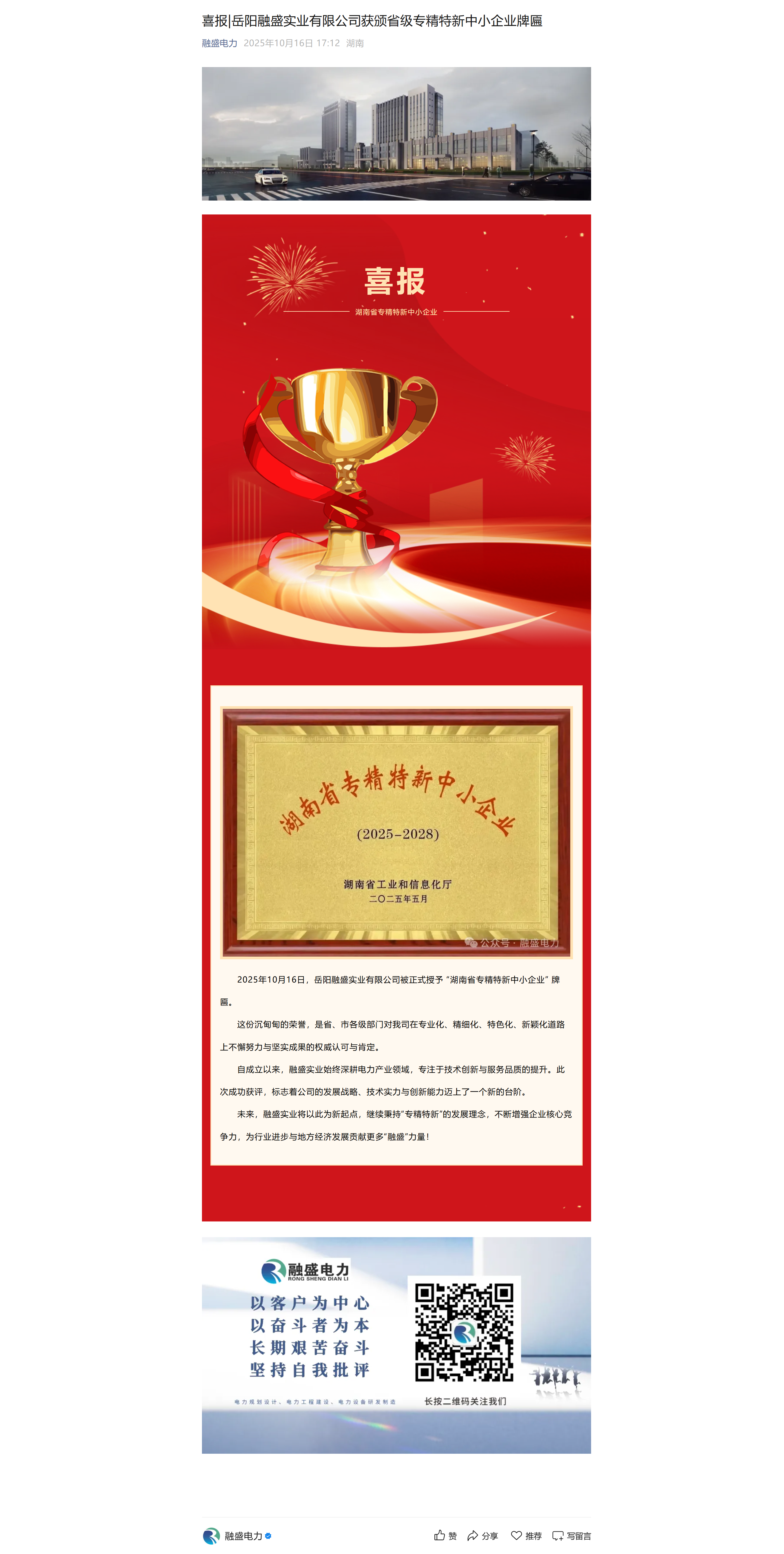 喜報|岳陽融盛實業(yè)有限公司獲頒省級專精特新中小企業(yè)牌匾